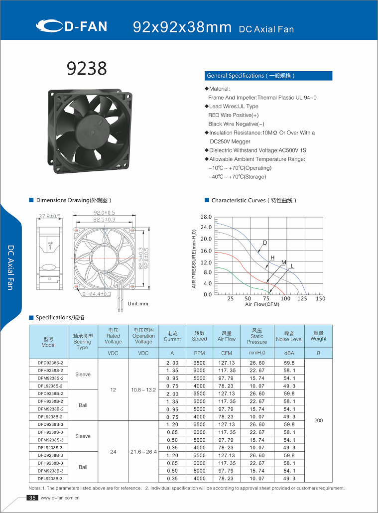 材料: 框架和叶轮:热塑UL 94-0 引线.UL类型 红色导线正极(+) 黑线负极(-) 绝缘电阻:10MΩ或以上,带DC250V高阻表 介电耐压:AC500V 1S 允许环境温度范围: -10℃-+70℃(运行) -40℃-+70℃(储存)